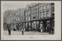 Bebouwing aan de Markt, ca. 1904. Tegen een van de gevels (met gaper) drie hoge ladders. -