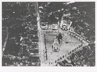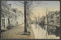 Luchtopname van de Markt gezien vanuit zuidelijke richting met het stadhuis in frontaal aanzicht, ca. 1930. Op de achtergrond de Agnietenkapel met aanbouw. - Bogen, zicht op de straat aan het water gezien vanaf Mallegatsluis, met op de achtergrond Molen de Roode Leeuw en de Gouwekerk