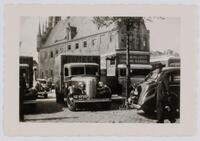 Vordering van paarden en motorvoertuigen op de Markt tijdens de mobilisatie, 29 augustus 1939. Vrachtauto's opgesteld achter het stadhuis. - Poldermolendreef, chinees restaurant winkelcentrum