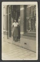 Nel Uljee in de deuropening van de winkel, Graaf van Bloisstraat 25, ca. 1925 -