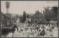 Vertrek van personeel van de kaarsenfabriek via het Buurtje wegens de middagpauze van 12. 00 uur. 1904. Vrouwelijk personeel. - Het laden (of lossen) van kaas voor het kaaspakhuis in de Jeruzalemstraat.