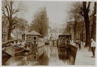 Gezicht op beide Visbanken aan de Gouwe met op de achtergrond de St.-Janskerk, februari 1905. -