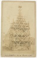 De voorgevel van het stadhuis op de Markt in de steiger vóór de restauratie, 1881. - Ridder van Catsweg, fietsers over het opgeknapte bruggetje vanaf de Van der Duyn van Maasdamstraat
