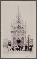 Het stadhuis op de Markt frontaal met ervoor een aantal mannen en een groepje kinderen als toeschouwers, ca. 1900. -