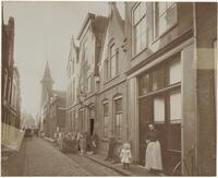 Opnamen van de pijpenfabriek van de firma P. van der Want Gzn in de Kuiperstraat 24 t/m 28, ca. 1905. Exterieur met toeschouwers. - Achter de Kerk, straatbeeld