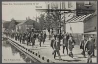 Vertrek van personeel van de kaarsenfabriek via het Buurtje wegens de middagpauze van 12. 00 uur. 1904. Mannelijk personeel. -