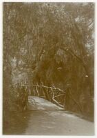 Een houten bruggetje in het groen (Van Bergen IJzendoornpark?). - Regentesseplantsoen, aangemeerde boot van de gereformeerde stichting Vacantiekring