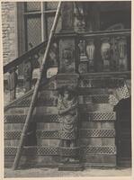 Opnamen van de restauratie van het stadhuis op de Markt, ca. 1950. De onderkant van het bordes. -