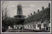 Een hoekje van het Roomse hofje aan de Raam met op de achtergrond de molen De Rode Leeuw. c. 1950. -