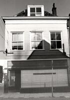 Gevels van de panden aan de Lange Tiendeweg, ca. 1980. De voorgevel van de instrumentenfabriek Hugo Kahn op no. 23 hoek Zeugstraat. -