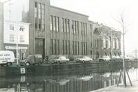 Het complex van het voormalige Gemeentelijk Energiebedrijf aan het Nonnenwater. Gebouwencomplex aan de kant van de Gouwe: links een vleeshouwerij, daarnaast de GLF (Gemeentelijke Lichtfabrieken). neg. A351-6-66 (detail). -