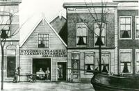 Tekening van de stoomhoutzagerij en pakkistenfabriek (timmerfabriek) Jan de Jong & Zn aan de Kattensingel 8, 9, 10 en 11. - De Goudse Padvinders Marsband op de Markt in een besneeuwde stad, 22 maart 1979.