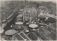 De kermis op de Markt gecombineerd met marktdag op donderdag. Overzicht vanaf de St.-Janstoren. -