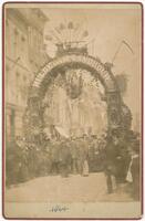 Een versierde ereboog op de Markt met autoriteiten en publiek, met de tekst: Hulde aan den landbouw. - Thorbeckelaan, rechts van het veld bij de scholen ligt een pad van loopplanken. Rechts de flat op de Willem de Zwijgerlaan en links de Savelberg.