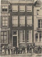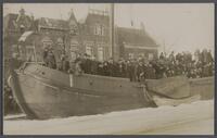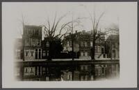Schaatspret op de bevroren Kattensingel voor huisnummers 40 (gesloopt), 41, 42 en 43, januari 1917. Toeschouwers op een boot tgv schaatswedstrijden op de hoek bij de Van Swietenstraat. -