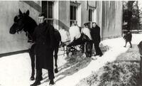 Melkbezorgers Bas Vermeulen en Adri van Asten van de Goudse Melkinrichting ploeteren door de sneeuw met hun melkkar met koperen kannen, in de strenge winter van 1940. Het paard Marie van kolenboer Versluis (van de Voorwillens) is ervoor gespannen. De paardenmenner is een zoon van Versluis. Op de ach -
