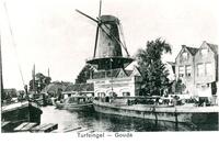 Ansichtkaart van de directe omgeving van molen De Rode Leeuw aan de Turfsingel, ca. 1910. -