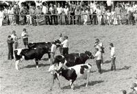 Opnamen van de Goveka op de Markt, 06-08-1986. De keuring van koeien. - Burgemeester P. van Dijke opent, met het hijsen van de vlag, de Goudse kaas- en ambachtenmarkt op de Markt.