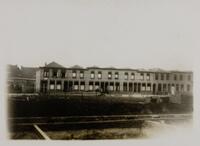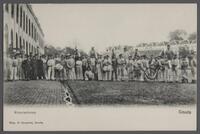 De kazerne van het 3e bataljon 4e regiment infanterie aan de Varkenmarkt met aktiviteiten in en rond het gebouw. c. 1904. Manschappen op het kazerneplein naast het gebouw. -