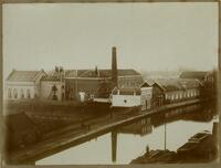 Gezicht op het bedrijfscomplex van de Goudse Machinale Garenspinnerij aan de Turfsingel voor de brand, 1895-1896 -