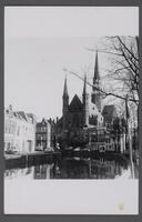 De St. Jozefkerk aan de Hoge Gouwe, gezien vanaf de brug tegenover de Lange Groenendaal, maart 1975. - Blekerssingel, rondvaartboot 't Groene Hart gooit touwen los