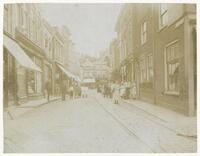 De Korte Tiendeweg aan weerszijden gezien vanaf de Markt. - Verschillende opnamen van de binnenstad, 1946. Gezicht op de noordzijde van de Lange Tiendeweg vanaf de Korte Tiendeweg.