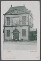 Gebouw de Waag aan de Markt frontaal en met de oostzijgevel. c. 1900.