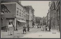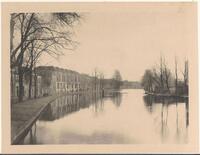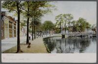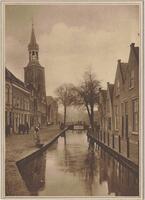 Gedrukte afbeelding van de Nieuwehavenvoor demping aan weerszijden genomen vanaf de Kleiwegstraat, met links de Vrouwetoren. -