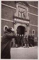 Leerlingen van de ULO school tijdelijk gehuisvest in het Weeshuis aan de Spieringstraat, voorjaar 1941. Vóór de poort. -