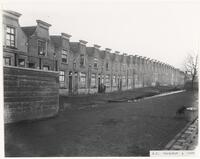 Een lange rij uniforme arbeiderswoningen aan de Boelekade met karakteristieke halsgevels. -