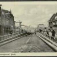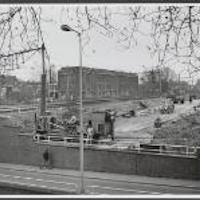 Spoorstraat, bouwwerkzaamheden aan extra brug voor vierde spoorlijn. Op de achtergrond sigarenfabriek Donkers. -