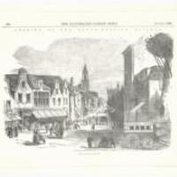 Gedrukte reproduktie van een staalgravure uit The Illustrated London News van 4-8-1855, voorstellende Opening of the Dutch-Rhenisch Railway, Gouda, in South Holland, met een -fantasievolle- versie van de Kleiweg rechts naast de molen (van Puik, afgebroken 1858) een diligence met opschrift Spoorweg deinst (sic). -