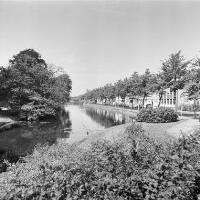 Opnamen van het Houtmansplantsoen. Gezicht op de Fluwelensingel met op de voorgrond een visser in een roeibootje. -