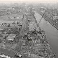 Vanuit een ladderwagen gezicht op de bouwlokatie Varkenmarkt (Nieuwe Markt). 07-04-1986Gezicht op de Lemdulstraat en de Blekerssingel. -