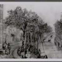 Ansichtkaarten met de Hoge Gouwe en Lage Gouwe, 1958. Tekening van de Gouwe vanaf de kromming westwaarts met de St. Joostbrug en de toren van de St. Joostkapel, die in 1869 werd afgebroken. -