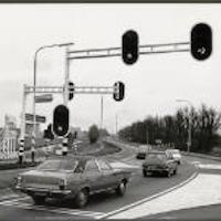 Burgemeester Jamessingel, heette toen nog Parallelweg, bij kruispunt Nieuwe Gouwe OZ - Afbeelding Coenekoopbrug over de Gouwe met verkeer op de r.w.12., genomen in oostelijke richting, 24-09-1981.