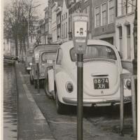 Geparkeerde auto's bij parkeermeters aan de Lage Gouwe tussen Lange Groenendaal en de Turfmarkt, 01-03-1976. -