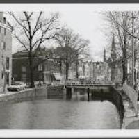 Hoge Gouwe, bestratingswerkzaamheden bij vervallen Crabethbrug tegenover de Turfmarkt. In de verte torens van de Gouwekerk. - Afbeelding Hoge Gouwe, bewoner van het Admiraalshuis op Turfmarkt 142 (schuin links in beeld) vaart met echtgenote in 'opduwertje' in de Gouwe. In beeld de Turfbrug, Turfmarkt en de hoek met Lage Gouwe.
