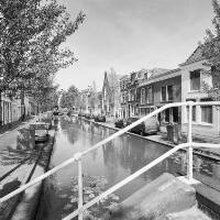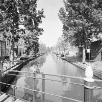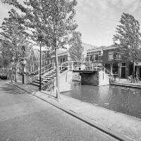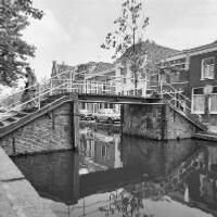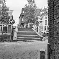 - Afbeelding Turfmarkt, de Trappenbrug na restauratie. Aan de brugleuning een bord van Schildersbedrijf Prevoo. In de gracht nog werkzaamheden met een kraan.