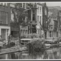 Turfmarkt, bestratingswerkzaamheden en werkverkeer. Ter hoogte van nr. 112 groeit kalmoes in de gracht, geplant door bewoonster. -