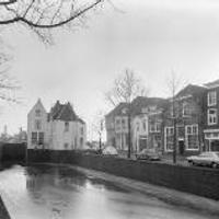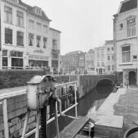 Zicht vanaf de St. Janskerk op de sluis in de Oosthaven, Gouwekerk aan de Hoge Gouwe, Lage Gouwe en gedeelte Wijdstraat.