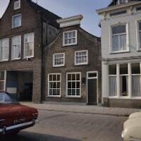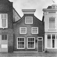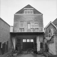 De bebouwing aan de Raam. c. 1930. Met beschuitfabriek C. Vergeer en daarnaast een winkel met opschrift boven het raam "Rotterdamsche ..." -
