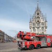 Brandweer Hollands Midden, kazerne Gouda - Afbeelding Burgemeester Boone en wethouder Melaard bij de introductie van twee nieuwe stadsvervoermiddelen van Westnederland op de Markt voor het stadhuis, 29-04-1991.
