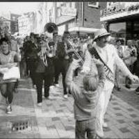 Jazzfestival, dweilband Brandaris tijdens de streetparade op de Markt, hoek Korte Tiendeweg, 10 september 1983. -