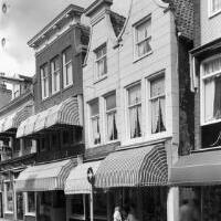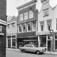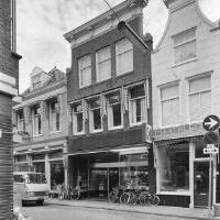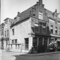 Twee panden aan het Houtmansplantsoen vanaf de Lange Tiendeweg zuidwaarts. Op de hoek slijterij en wijnhandel het wapen van Gouda -