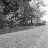 St. -Janskerk, 1932. Achter de Kerk een shot door de steunbeer van de St.-Janskerk in oostelijke richting. Links de muur van de St.-Janskerk, rechts is het pand van de firma Roodbol zichtbaar. In de achtergrond het kostershuis van de kerk. -