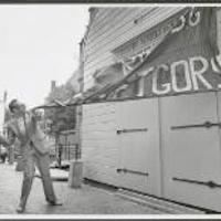 Achter de kerk, man, op de rug gezien, loopt onder de poort in de steunbeer van de St. Janskerk, voorjaar 1934.