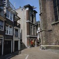 Achter de Kerk, St. Janskerk glas in lood raam steunbeer met doorgang en woning over brugje