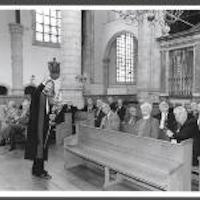 Achter de Kerk, Poolse bisschoppen in de banken van de St. Janskerk, met voor hen koster N. Metselaar die de rondleiding verzorgt