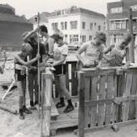 Jeugdvakantiewerk, 6-8-1981. Het timmeren van de hutten in de Tuinstraat. - Afbeelding Opnamen van de Walestraat. De winkel in zuivelproducten op no. 24 / hoek Tuinstraat. publ. GC 08-02-1964.